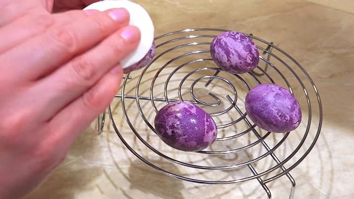 Можно сразу же переложить яйца из горячего раствора на решётку, а можно оставить их в растворе ещё на 20-30 минут, чтобы они приобрели более насыщенный оттенок. Однако и после 10 минут белые яйца идеально и насыщенно окрашиваются!
