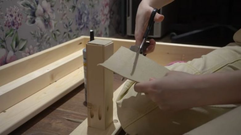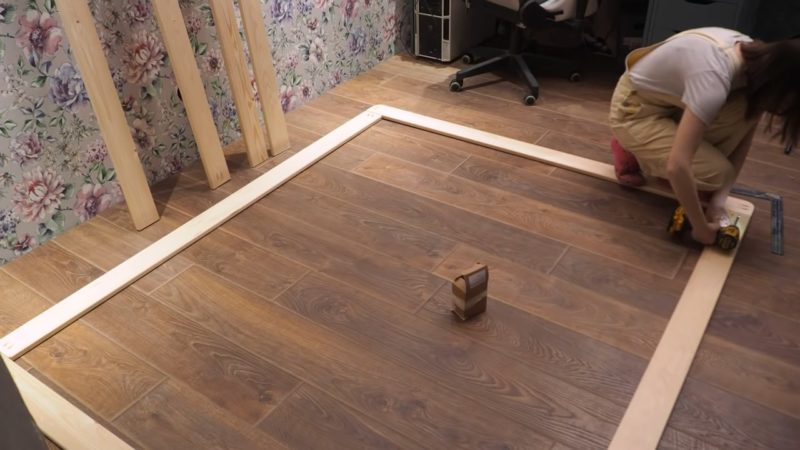 Кровать классически собирается из досок. Длина досок зависит от будущих размеров кровати. Сначала собирается каркас — рамка, на косые срезы и саморезы.