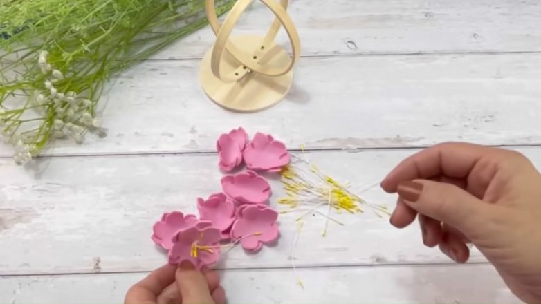 Из фоамирана вырежьте цветы. С помощью утюга на небольшой температуре согните их — от нагрева фоамиран меняет форму.