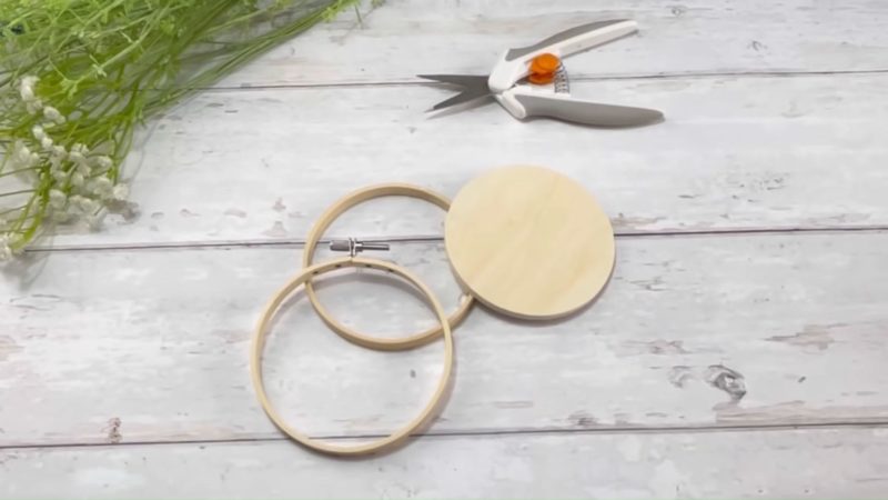 Пяльцы соедините крест-накрест между собой, приклейте на горячий клей к деревянному кругу подходящего диаметра.