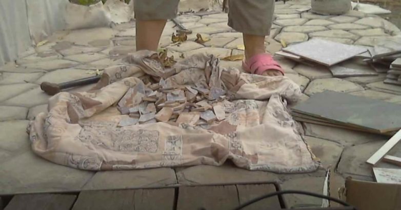 В данном случае мы будем использовать битую плитку. Чтобы получить осколки, стелим на пол покрывало, а сверху накладываем остатки керамической плитки.