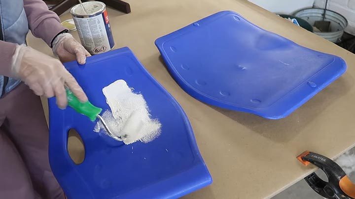 Пластиковые части стула очистите, обезжирьте, покройте грунтовкой и акриловой краской.