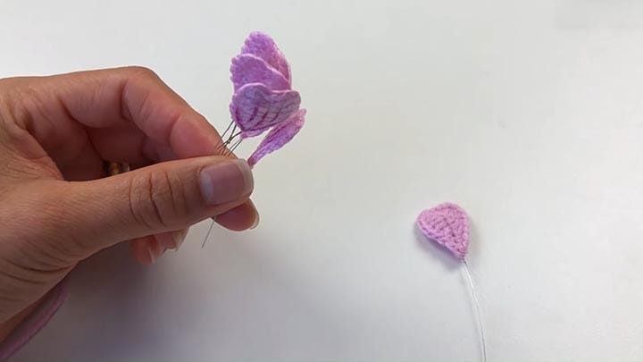 Провяжите ещё 2 ВП для подъёма. Сделайте накид. Продолжая обвязывать проволоку уже с другой стороны, провяжите такие же петли, как и в предыдущем ряду, но в обратной последовательности: сначала ССН в первые 3 петли (в самую первую — 2 ССН), там, где был ПСН — вяжите ПСН, и последние две — это СБН. Таким образом, с обеих сторон вязание получится симметричным. В конце сделайте соединительную петлю к концу ряда и обрежьте нить. Первый лепесток цветка готов!
