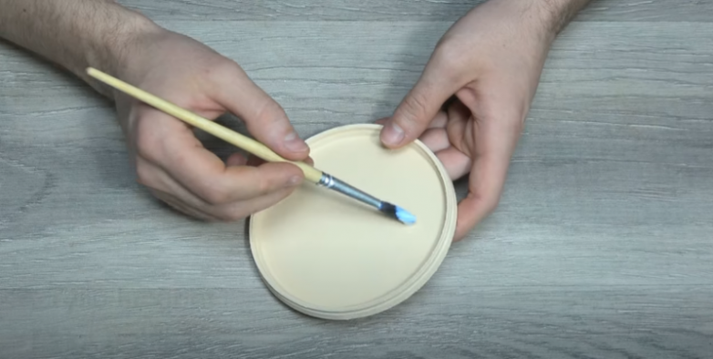 Также нам потребуется основание, на котором будет стоять горшок, его диаметр зависит от размера горшка. В качестве основания можно использовать поддон для горшка или, как в нашем случае, подходящую по размерам пластиковую крышку. При необходимости покрываем выбранное основание краской и лаком.