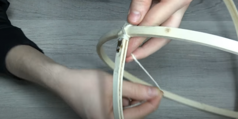 Затем склеиваем пяльцы друг с другом, соединяя их в месте образовавшихся после снятия креплений разъемов. Место соединения маскируем, а заодно и декорируем, например, при помощи хлопкового каната, его закрепляем обвязкой и фиксируем при помощи клея.