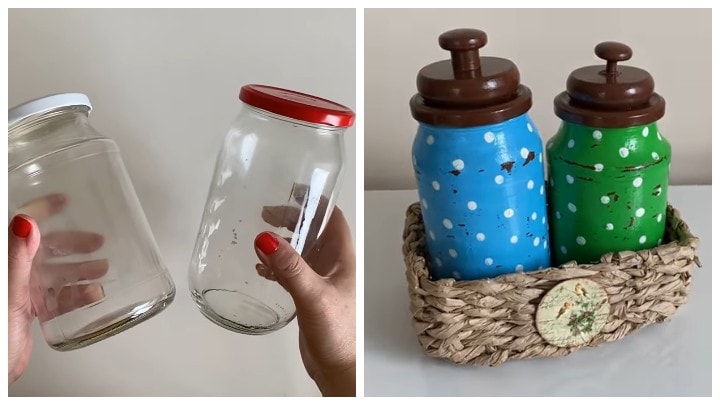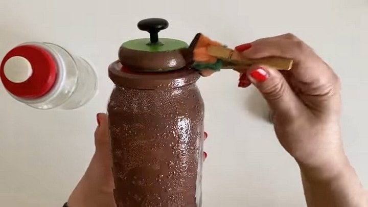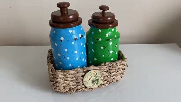 Если вы хотите, чтобы комплект выглядел винтажно, надо будет покрыть банки ещё одним слоем краски, но уже контрастного цвета. А перед этим кое-где по поверхности нужно «пройтись» обычной стеариновой свечкой.