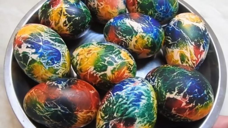 Покрасьте таким способом яйца к Пасхе, и у вас получится замечательный радужный узор. Понадобятся только салфетки и жидкий пищевой краситель для яиц.