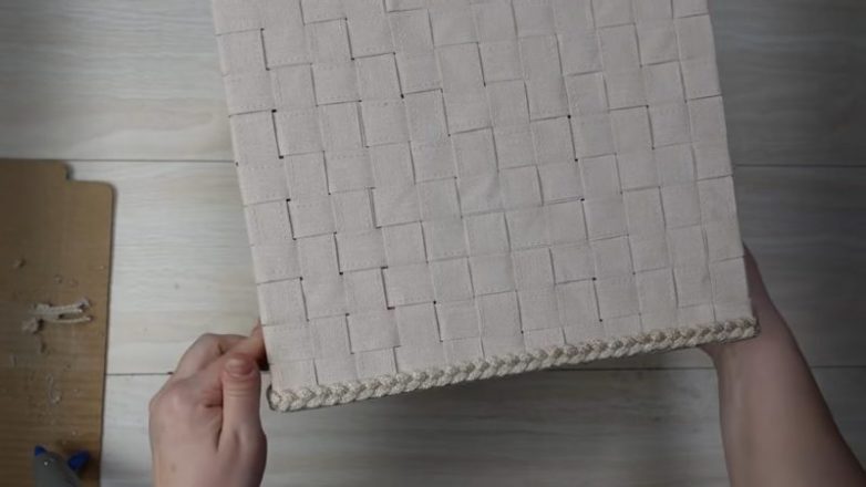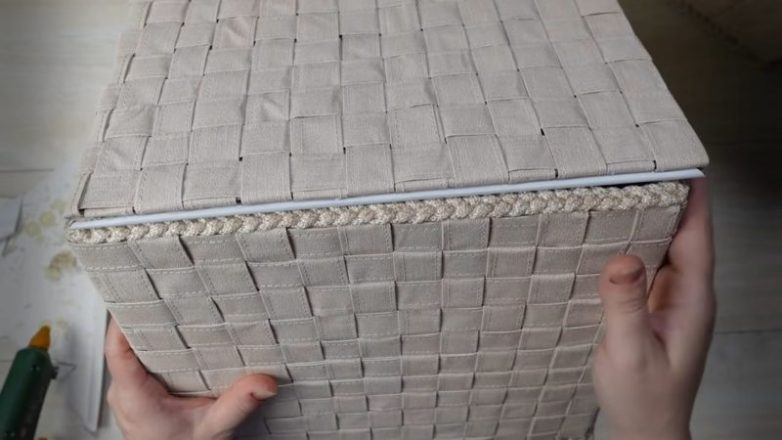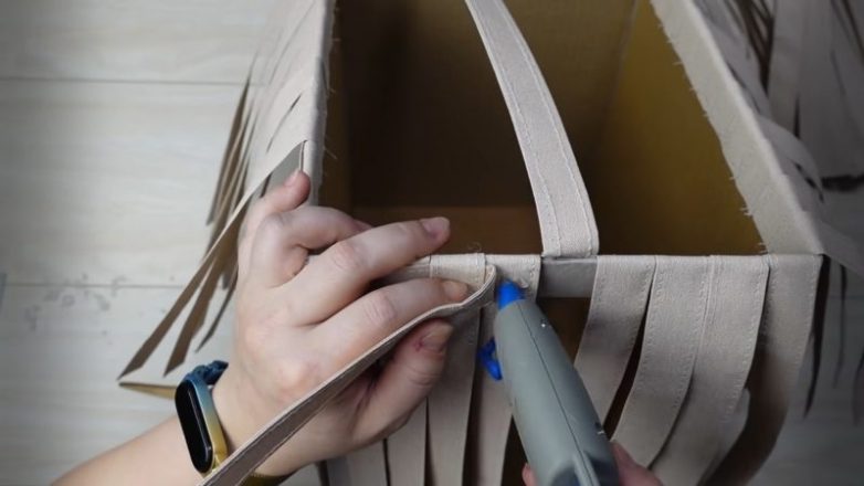 К картонной коробке по всему периметру приклейте на горячий клей полосы, загибая внутрь буквально на 3 см. Затем сделайте плетение, приклеивая и переплетая полоски друг между другом, начиная с самого верха, заканчивая низом.