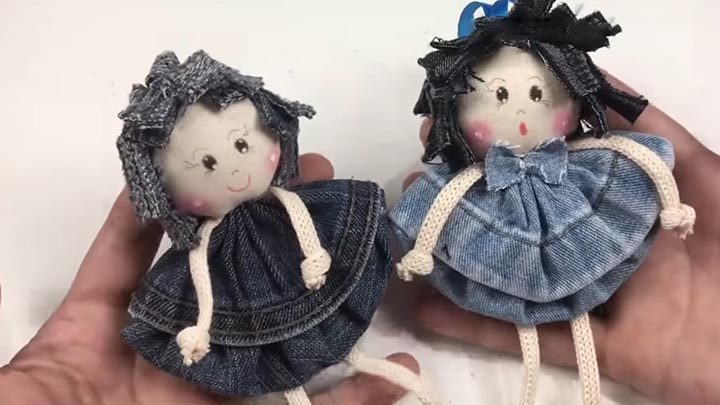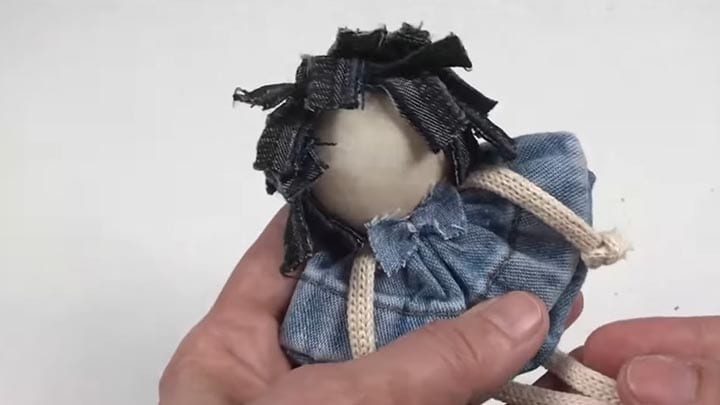 Из кусочков джинсов сделайте волосы, приклейте на голову. Также можно вырезать бантик из джинсов.
