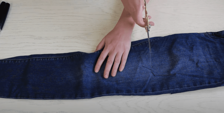 Оттмеряем необходимую длину будущего чехла от низа штанины с небольшим запасом и обрезаем.