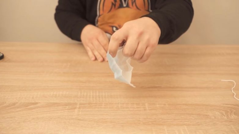 Отрежьте сбоку кусочек маски, чтобы открылся «кармашек». У отрезанной части снимите завязку — она ещё пригодится.