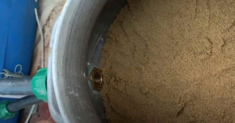 Внутрь бидона засыпаем специальный кварцевый песок, который используется в фильтрах для бассейна. Нужно будет около 40 кг песка. Засыпаем песок до уровня верхней муфты.