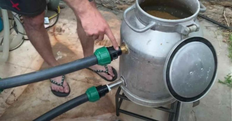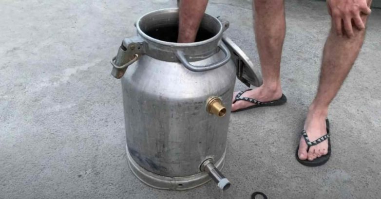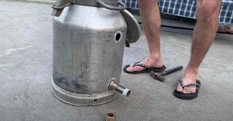 Алюминиевый бидон устанавливаем на металлическую подставку, к которой прикреплена газовая печка. Важно при этом, чтобы крышка емкости была герметичной.