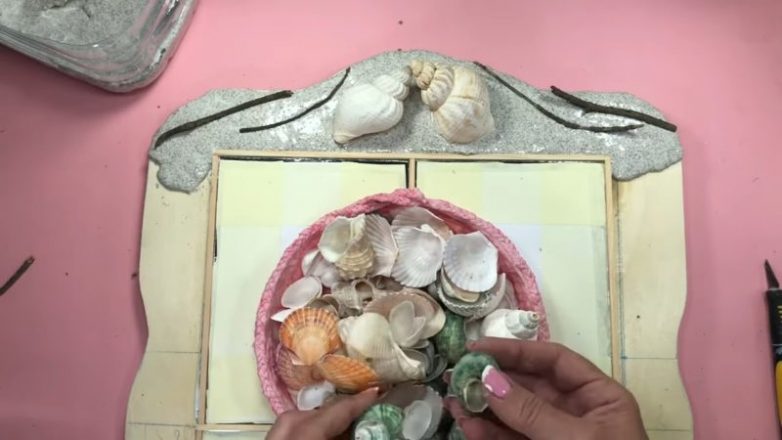 Разлейте её по краям фанеры и приклейте ветки и ракушки.