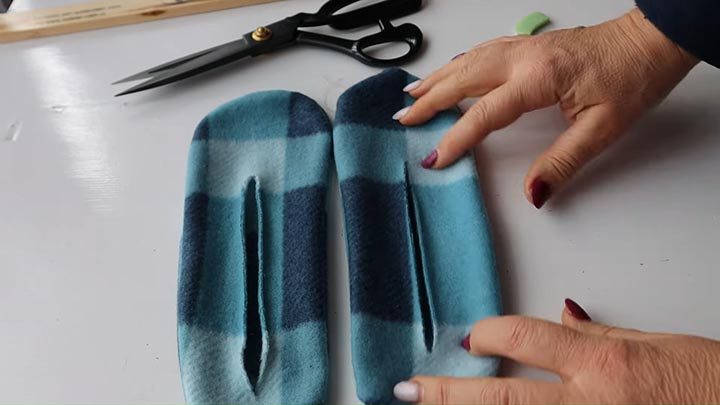 На плед приложите тапочки, обведите. Вырежьте с запасом 1 см, по 2 детали на каждую ногу. Сложите лицевыми сторонами друг к другу внутрь, изнаночная — снаружи.