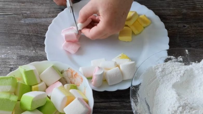 На 3 части сахарной пудры возьмите 1 часть крахмала, смешайте. Далее, возьмите маршмеллоу. Если они цветные, то дополнительно никаких красителей использовать не надо. Разделите маршмеллоу по цветам ножницами.