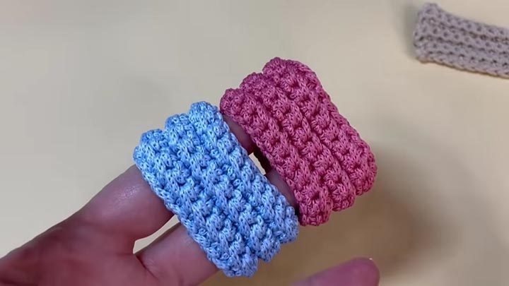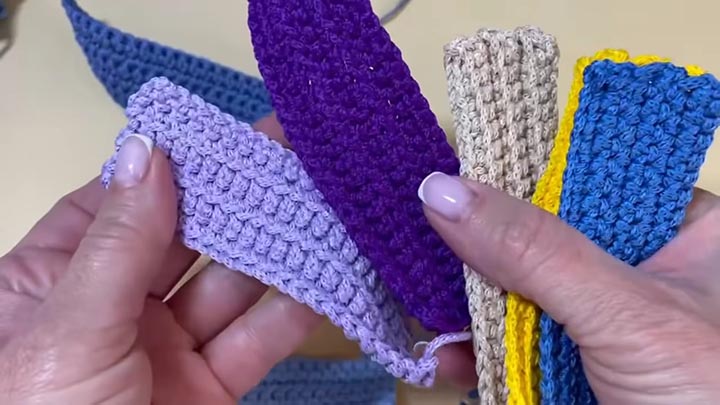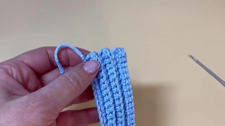 Второй и последующие ряды вяжите столбики без накида за заднюю стенку петли. Всего нужно провязать 6 рядов. Для одной игрушки свяжите 3 такие полосы. Можно связать эти полоски из пряжи разных цветов — результат получится интереснее.