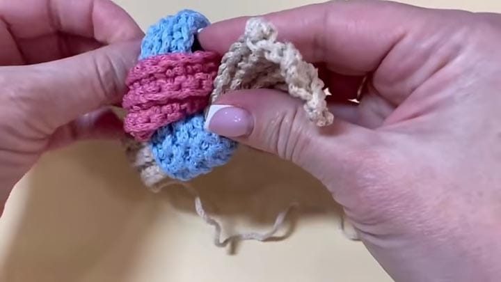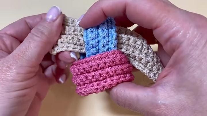 Две полоски из трёх сшейте в кольцо — той же пряжей (шнуром), вдетой в иглу с толстым ушком, сшейте два края полоски друг с другом.