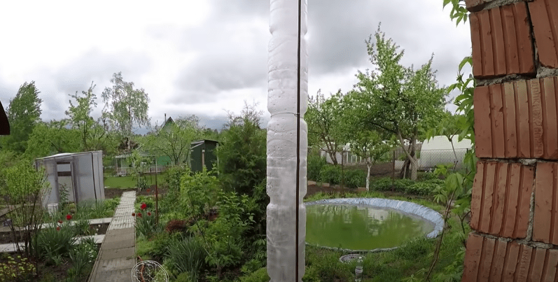 Верх трубы из бутылок подрезам под форму вашего водостока на крыше. К водостоку же крепим и металлическую опору, на которой зафиксирована самодельная труба.