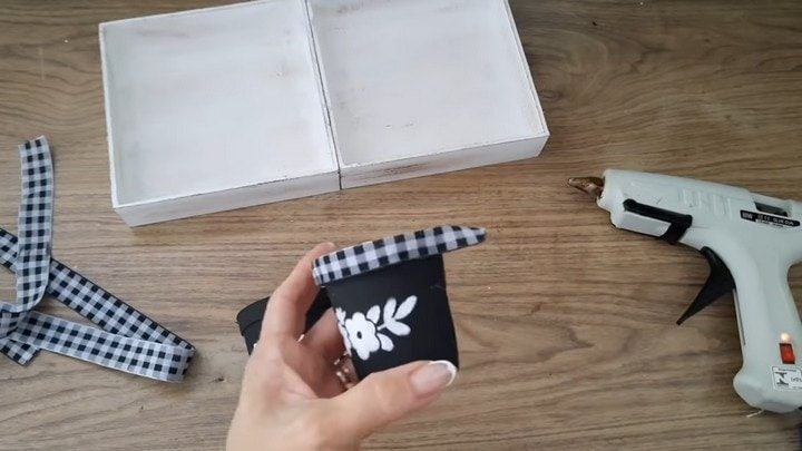 Коробки склеиваем между собой, а половинки горшка сначала красим в чёрный цвет, а затем украшаем при помощи трафарета. Край можно декорировать при помощи ткани или готовой ленты.