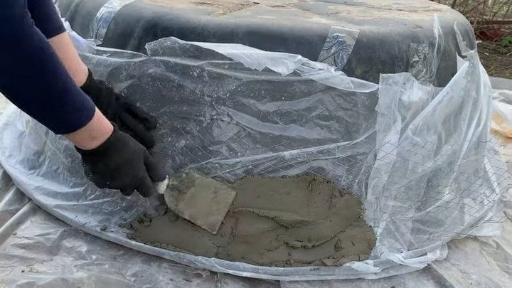 В данном случае за шаблон взяли ёмкость для мини пруда. Под ёмкость постелили полиэтилен, также оклеили им стенки шаблона, чтобы бетон не прилип. Далее взяли кладочную сетку высотой 20 см и нарезали на 4 равные части. После этого заместили раствор. Понадобилась одна часть бетона, две части песка и вода.
