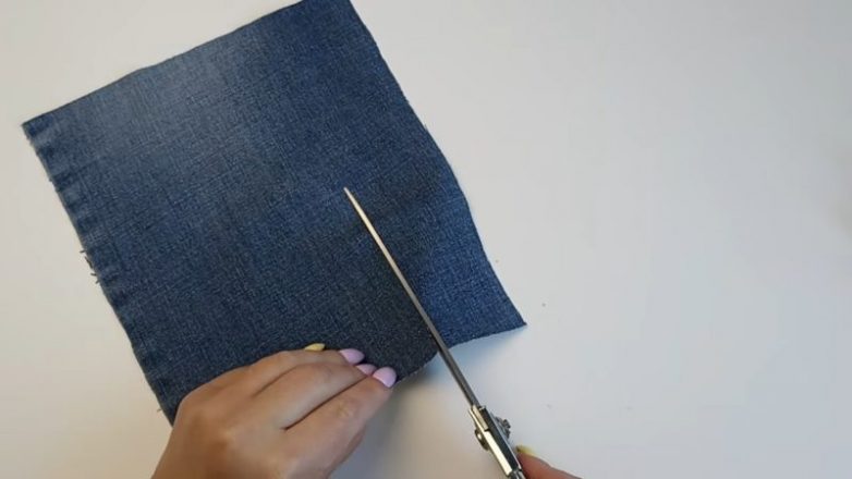 Нарежьте джинсы на полосы шириной 5 см, длиной 24 см. Сложите полосу 4 раза, как показано на фото ниже.