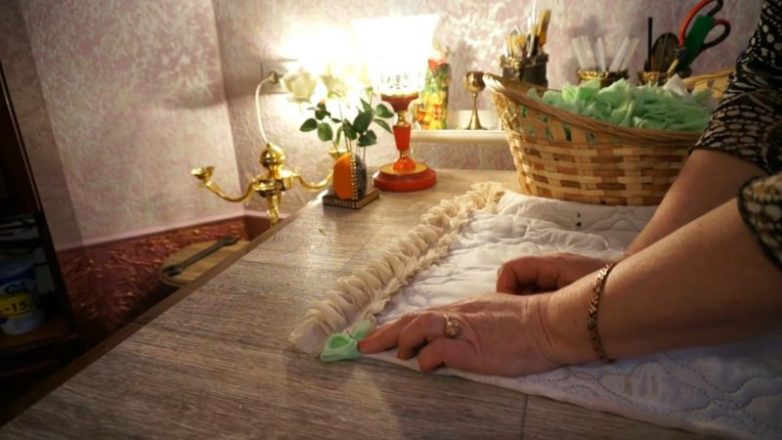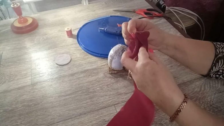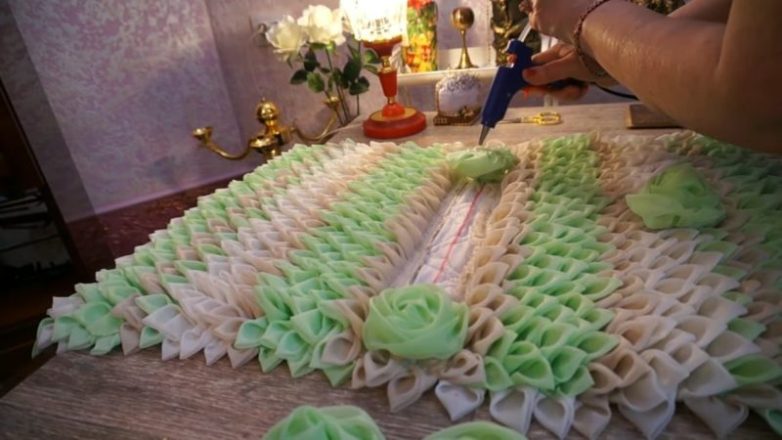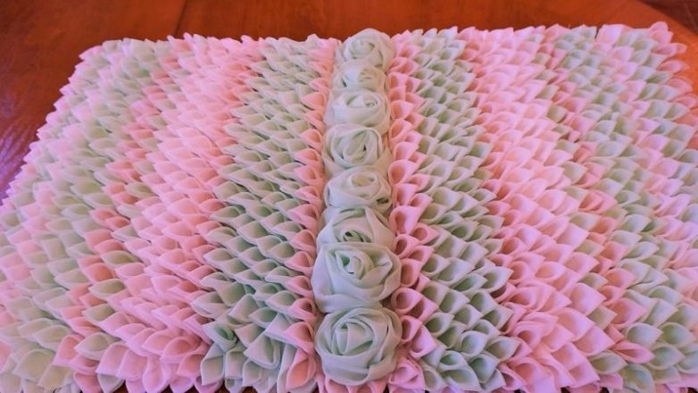 Для украшения центра коврика приклейте розы из тюля. Сделать их просто. Для одной розы вырежьте полоску длиной 80-90 см и высотой 8-9 см. Угол согните, прометайте. Затем начните скручивать.