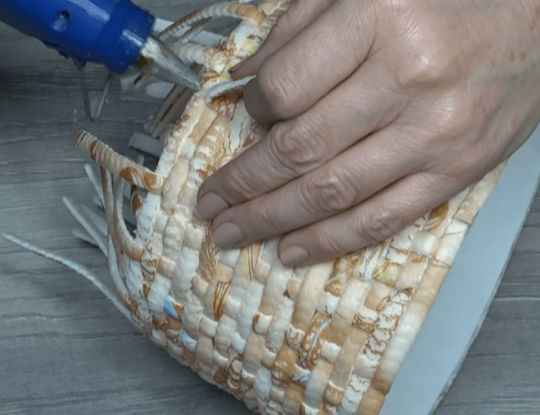 По мере прокладки рядов соблюдаем шахматный порядок. В результате получаем эффект плетения. Дойдя до низу, дополнительно фиксируем вертикальные полосы клеем и даем хорошо подсохнуть.
