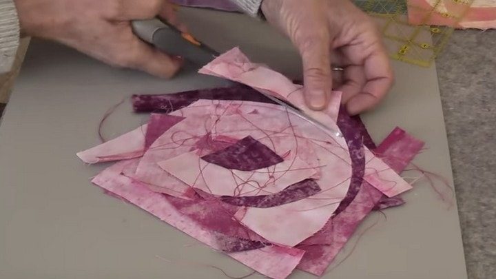 Выберите в качестве центра своей розы один из самых маленьких сегментов (это может быть, самый тёмный, средний по цвету, или самый светлый лоскуток). Этот маленький фрагмент будет центром, вокруг которого будут нашиваться все остальные «лепестки». Первый «лепесток» положите поверх округлой стороны выбранного центра так, чтобы краешки равномерно выступали. Сшейте лоскутки.