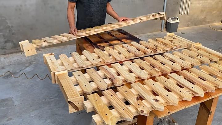 Приготовьте две длинные деревянные доски. На них на одинаковом расстоянии друг от друга прикрепите саморезами маленькие остроконечные доски от паллет.