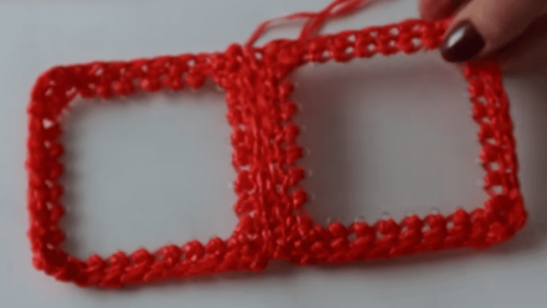 Соединяем детали между собой крючком при помощи кетлевочного шва так, чтобы полоса проходила между двумя частями сумки.
