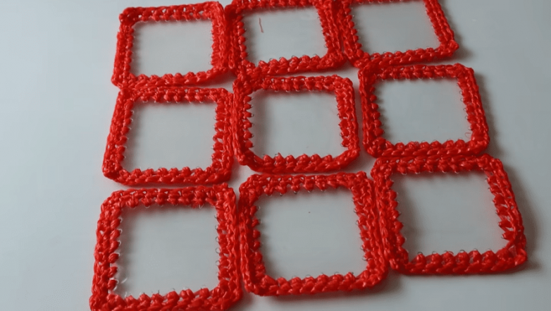 По периметру каждого квадрата делаем разметку с интервалом в 1 см с небольшим отступом от края, не пропуская углы. Воспользовавшись паяльником делаем отверстия по разметке.