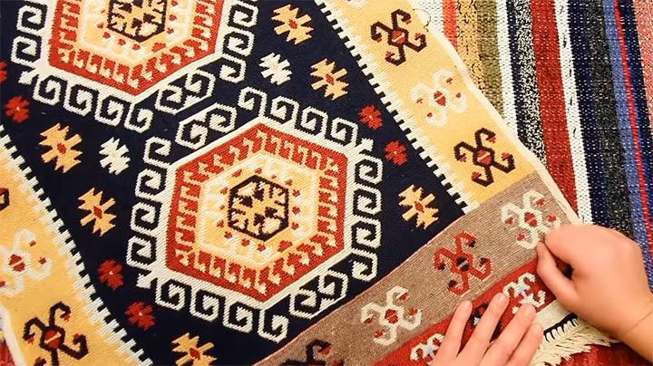 Сегодня в продаже можно найти немало турецких и индийских ковриков, которые стоят недорого, сшиты крепко в несколько слоёв и оформлены красивым рисунком. Даже если край у них неровный — ничего страшного! Будем перешивать в обалденную вещь для интерьера.