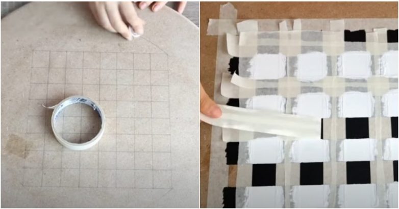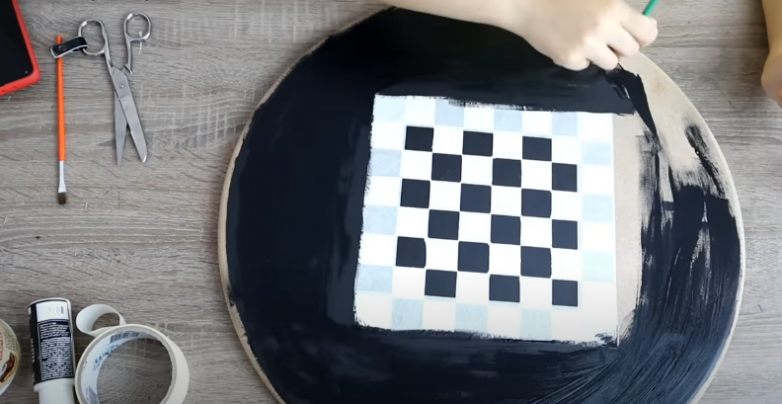 Затем переходим к основному декоративному элементу, изюминкой нашего стола является шахматная доска — именно ее и будем рисовать. Намечаем сначала центр круга, а затем рисунок доски на столешнице. После чего, защищая ненужные элементы малярным скотчем, раскрашиваем квадраты в нужном порядке. Если вы не уверены в правильности своей модели, перед покраской внимательно сравните ее с настоящей шахматной доской.