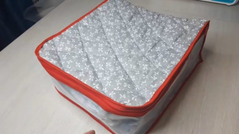 Всё готово! Это оригинальный органайзер для хранения вещей, он же — сумка-чехол. Благодаря плёнке, видно, что находится внутри. А значит, таких сумочек можно нашить достаточное количество в одном стиле, чтобы красиво и компактно хранить в шкафу подушки, постельное белье, полотенца и не только!