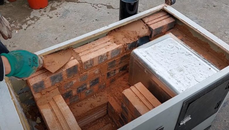 На следующем этапе надо будет затворить глиняно-песчаный раствор и затем облицовывать холодильник изнутри кирпичом. По ходу пьесы вырезаем в металлическом корпусе отверстия и устанавливаем дверцы для топливной камеры и поддувала, а также монтируем духовку.