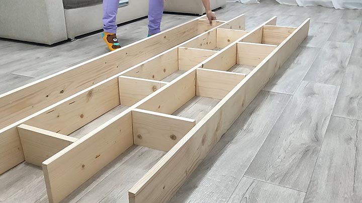 5 досок 2,5 м разложить на равном расстоянии друг от друга. Между ними положить полочки. Высота между полочек — 60 см, но это — по усмотрению хозяев. Присоединить полочки к доскам саморезами.