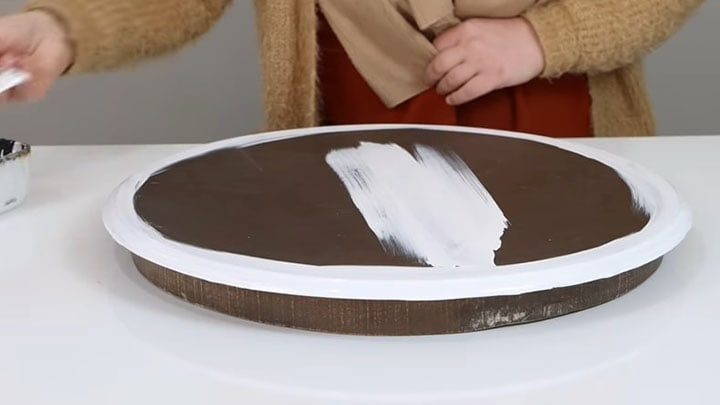 Поверхность столешницы зачистите мелкой наждачной бумагой. Затем выровняйте тон белой акриловой краской. Может потребоваться два-три слоя с промежуточной просушкой.