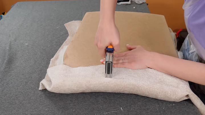 Сверху, чтобы всё сгладить — слой синтепона. И, наконец, новую ткань. Чехол можно предварительно прошить в местах сгиба, а затем — прикрепить степлером.