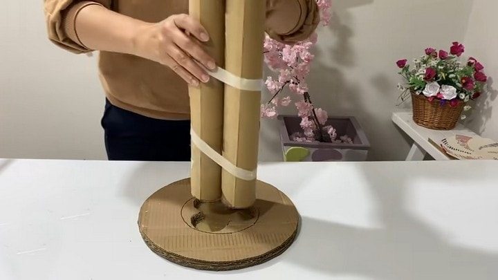 Основой для ствола может стать твёрдая картонная втулка или, как в данном случае, рулон бумаги, который нужно нарезать (с помощью ножовки) на три куска высотой по 50 см. Между собой куски нужно скрепить бумажным скотчем. Также для основы потребуется вырезать и склеить между собой как минимум 4 картонных круга. «Столбы» нужно поставить строго по центру круглой основы, обвести и вырезать канцелярским ножом отверстие по получившемуся контуру. После этого наклеить ещё один круг без отверстия и вклеить в углубление столбы-основы.