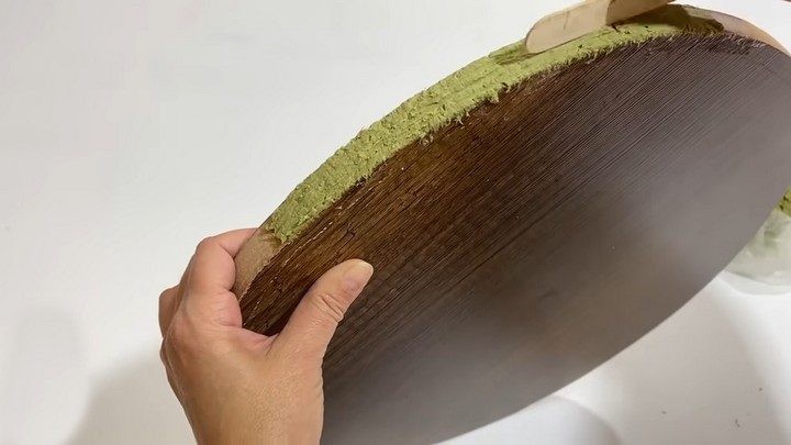 Столешницу для стола можно вырезать из доски или купить готовую. Нанося слой клея ПВА, обмажьте торец «тестом» и придайте текстуру коры. После этого «тесту» нужно дать очень хорошо просохнуть.