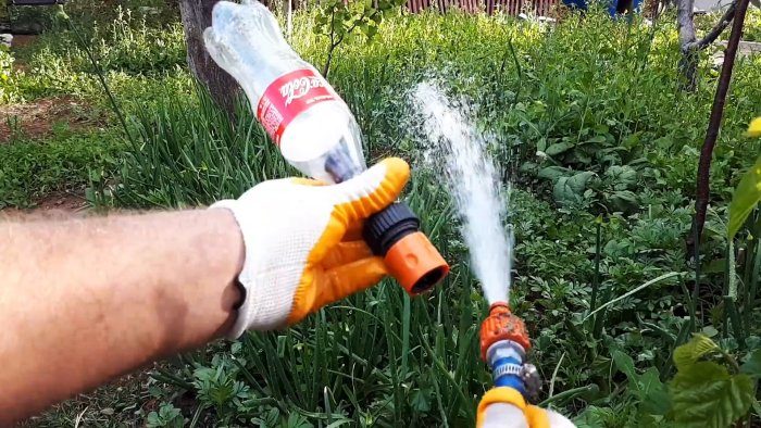 Пластиковая бутылка 0,5-1 литра.Кусок шланга 10-20 см.Переходник на поливочный шланг.