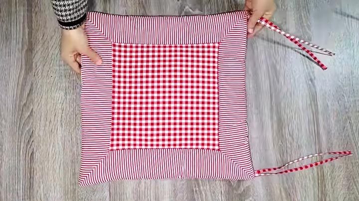 Выверните ткань, зашейте отверстие вручную. По бокам внутрь можно пришить полоски ткани (завязки), но это необязательно. Подушка-сидушка готова!