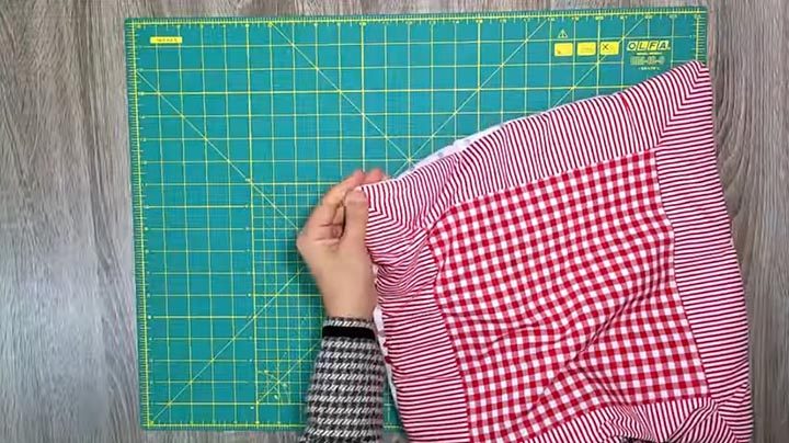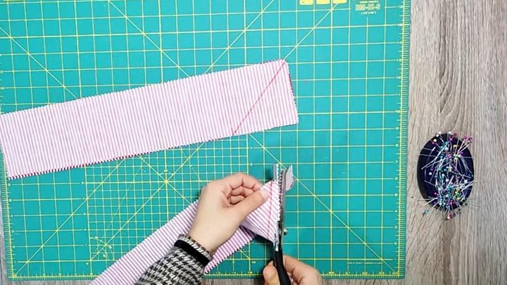 Подготовьте ткань трёх цветов: первый — для обратной стороны подушки (42*42 см), второй — для бортиков (4 шт. по 46*10 см), третий — для центральной части (квадрат) 28*28 см. Сложите ткани для бортиков друг другу лицевой частью, по две полоски вместе. Отступите от края 10 см, проведите косую линию до угла. Прошейте на машинке. Обрежьте ненужную часть ткани.