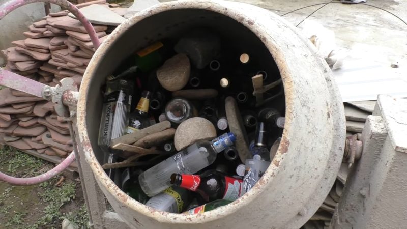 Цветные стеклянные бутылки поместите в бетономешалку вместе с крупными камнями, включите на 2-3 часа, чтобы стекло разломалось, а края битых кусочков закруглились и были не опасны в работе.