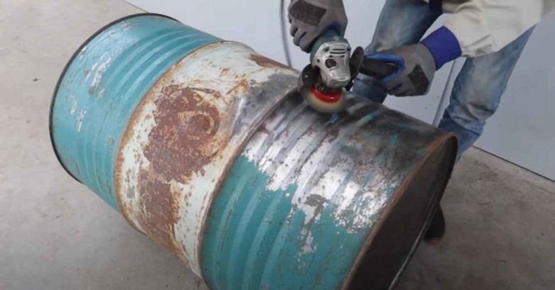 Первым делом бочку необходимо будет хорошо вымыть внутри. Потом зачищаем ее от заводской краски с помощью болгарки.