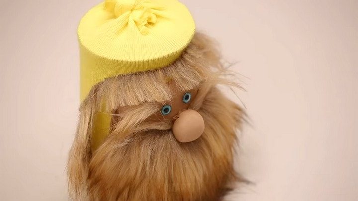 Нос — это кусочек капрона, наполненный холлофайбером или любым другим наполнителем, а борода — лоскут ненужного искусственного или натурального меха. Из него же можно сделать выразительные брови и усы. Глазки можно взять готовые или приспособить обычные пуговицы. Тонкая полоска меха, подстриженная в районе чёлки, станет причёской сказочного героя. Наклеивается «прическа» по краю капронового «лица».