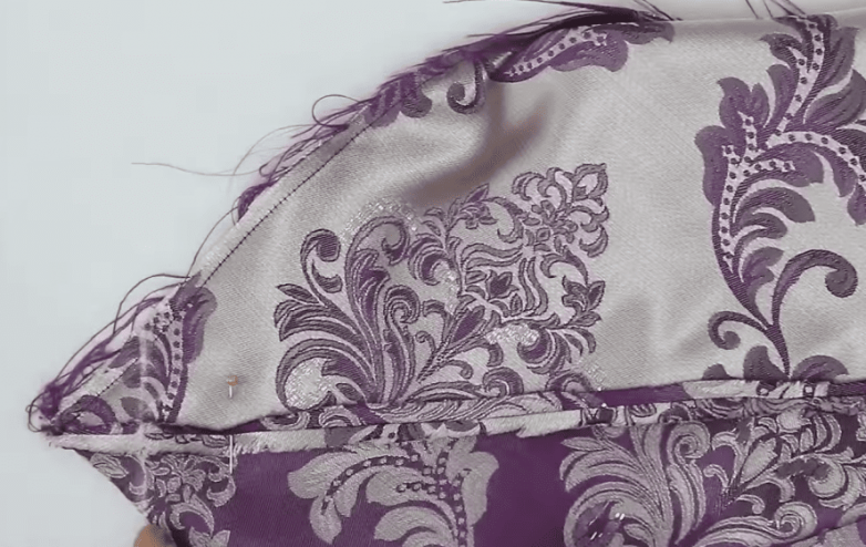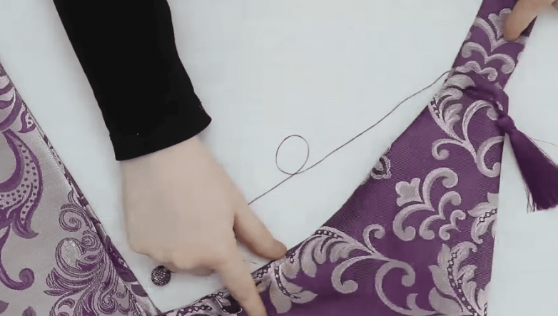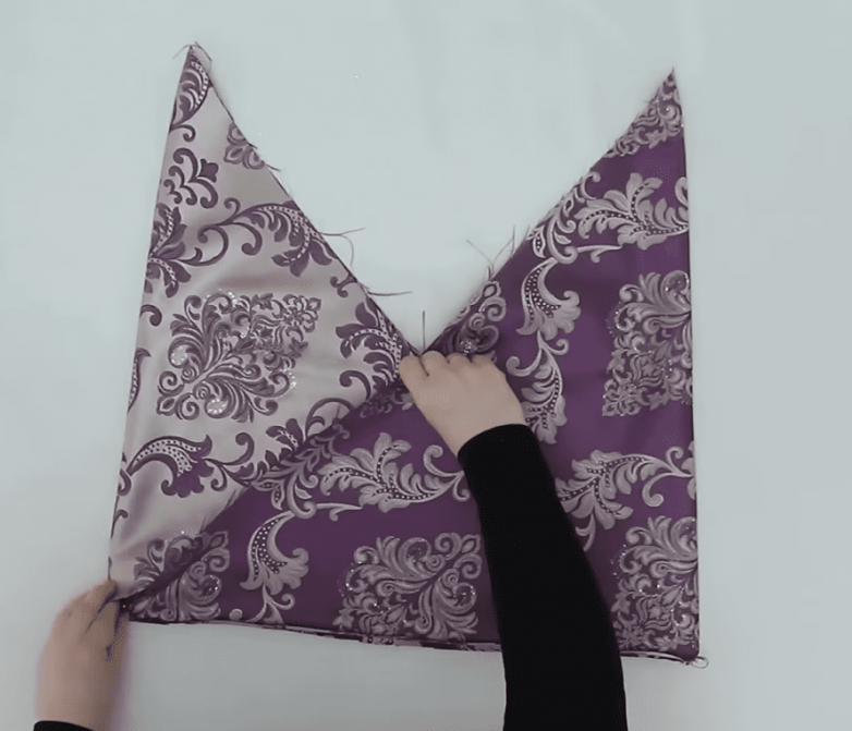 Следующая задача — сделать мешочек в форме флажка. Для этого аккуратно соединяем ткань по диагонали при помощи портновских булавок с таким расчетом, чтобы швы находились снаружи сначала с одной стороны, а затем с другой и сострачиваем. Дополнительно прокладываем строчку по основанию, а затем выворачиваем деталь.