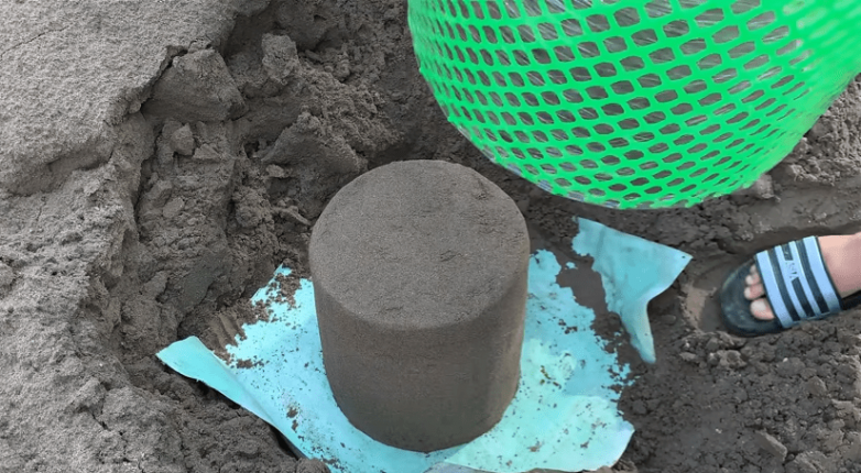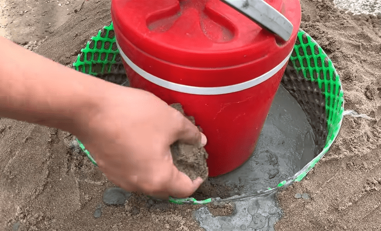 Делаем в куче песка углубление и формируем площадку. Низ выравниваем. Берем пластиковое ведро с обрезанным донышком или остаток трубы подходящего диаметра. Главное, чтобы диаметр был значительно меньше, чем у заготовки из садовой сетки. Наполняем ведро мокрым песком, хорошо утрамбовывая, а затем снимаем.