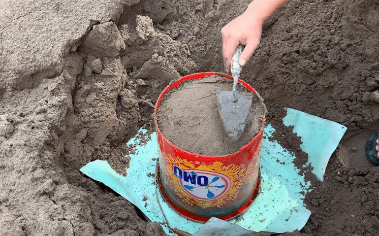 Аккуратно извлекаем ведро, а затем заполняем цементным раствором образовавшееся посредине углубление.